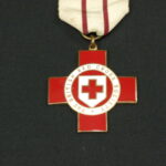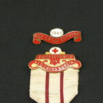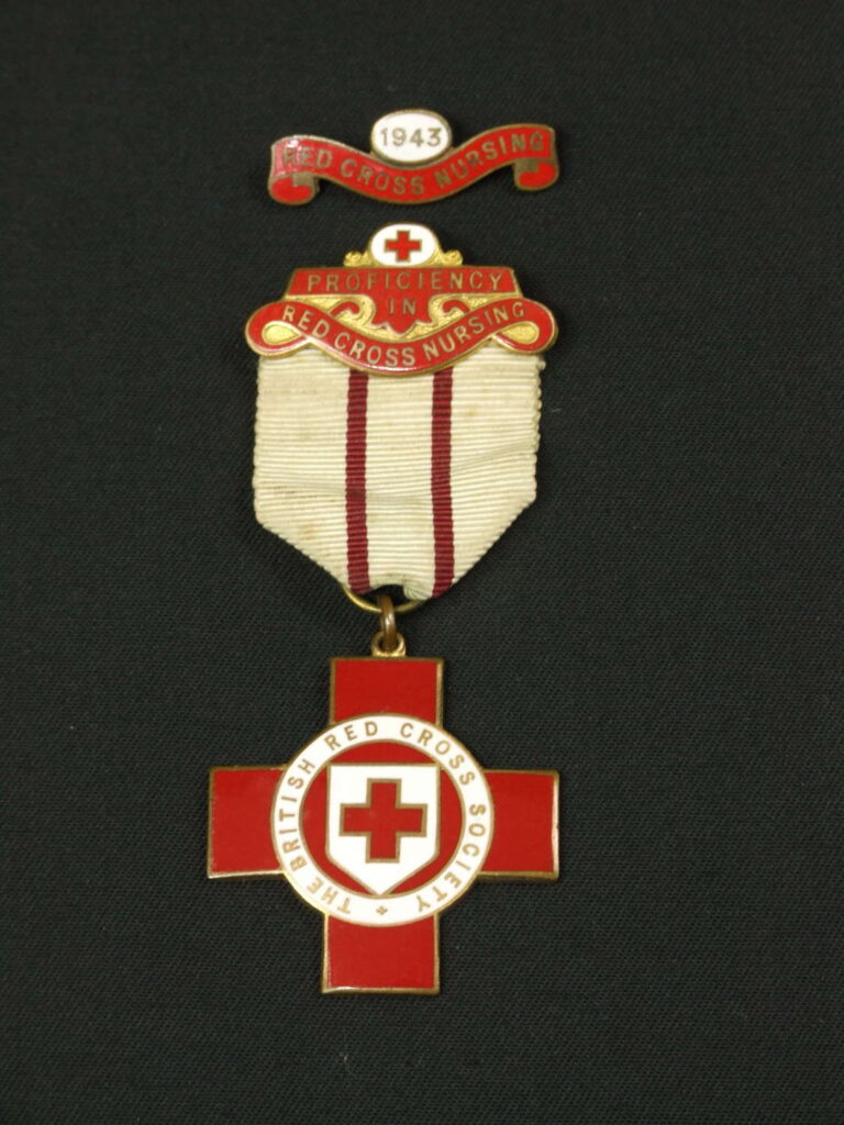 A World War Two British Red Cross Society Proficiency Badge for proficiency in nursing with a 1943 dated service bar, awarded to 36406 A.M.J Richards in 1942.