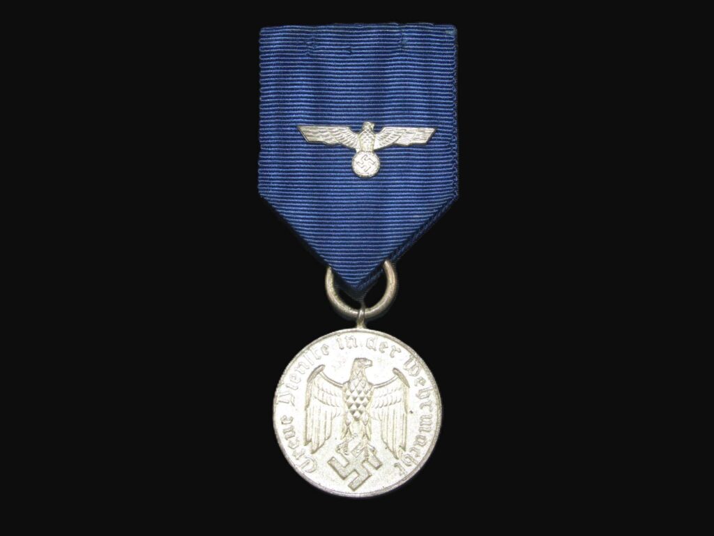 A very nice Heer/Kriegsmarine Dienstauszeichnung für 4 Jahre manufactured in silvered magnetic metal with only minor wear.