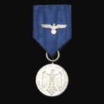 Mounted on a cornflower blue ribbon with an attached silvered Wehrmacht Hoheitszeichen (Eagle).