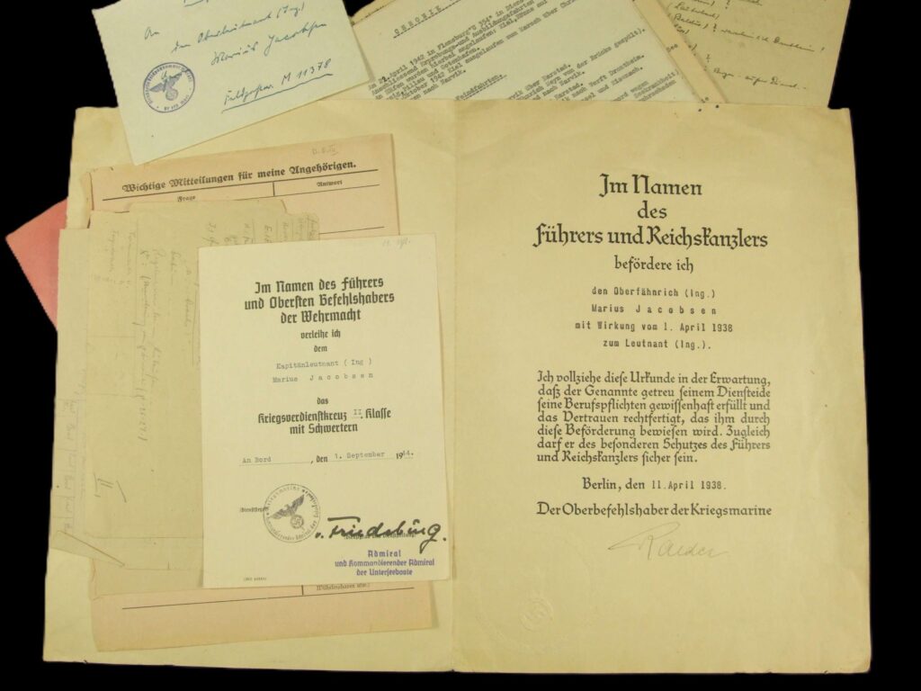 A collection of paperwork relating to Oberfähnrich Marius Jacobsen including, most importantly his promotion certificate to Leutnant Engineer with the original ink written signature of Oberbefehlshaber der Kriegsmarine (Commader in Chief of the Kriegsmarine), Erich Raeder.