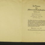 This large and impressive Document is dated 1938 and carries the usual eagle and Swastika embossed document stamp in the lower left corner. Overall condition is very good, Raeder’s signature still clear.