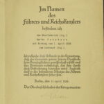 Also included is Jacobsen’s Award Certificate for the War Merit Cross Second Class with Swords with again an original Signature, this time that of Admiral Hans-Gerg von Frieburg, Commanding Admiral of U-Boats. At this time Jacobsen was a Kapitanleutnant. Dated 1st September 1944, the Certificate is in very good condition.