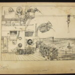 These are marked “War Cartoon” number five, six and twelve produced for the “North Sea Times” with the titles “Doubling” 29.2cm x 23cm showing sailors exercising on deck, “Submarine Attack” 29.2cm x 23cm with a whale mistaken for the sub and being shot at from all angles the other is as mentioned “A Suggestion For Attacking Keil” 18.5cm x 15.5cm with a remarkable underwater boring machine.