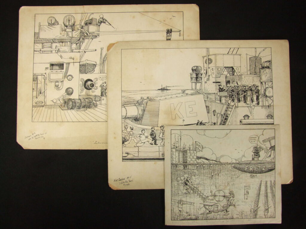 These are marked “War Cartoon” number five, six and twelve produced for the “North Sea Times” with the titles “Doubling” 29.2cm x 23cm showing sailors exercising on deck, “Submarine Attack” 29.2cm x 23cm with a whale mistaken for the sub and being shot at from all angles the other is as mentioned “A Suggestion For Attacking Keil” 18.5cm x 15.5cm with a remarkable underwater boring machine.