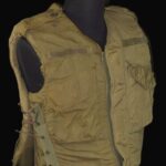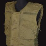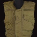 An olive drab (OD#3), one-piece design based around 12 layers of vinyl-sealed, resin-laminated, 1050 denier ballistic nylon. It protected the torso from shoulder to waist. It features a large, front-closing aluminium zipper and a snap-shut fly to cover it. It has two sizable front pockets, and hangars for up to 6 grenades above them (3 over each pocket, hung by the safety lever, interestingly enough). The vest came in three sizes – Small, Medium, and Large, weighing 6.5lb, 7.3lb, and 8.25lb, respectively. Adjustment to the individual user could be executed with some lacing along the side – a potential gap, if it is significantly undersized for you, but an easy way to remove the vest from a casualty. The laces on this one are probably not original.