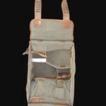 Inside there are partitions whilst the flap has one large pocket and two small pockets. A flapped tubular leather pocket held the poles which when joined together supported a wire.