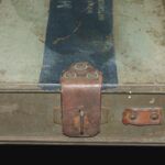 On one end is a leather carrying handle, a securing strap arrangement on the other, the leather strap locking the securing strap in in place, broken off. The lid carries the details.